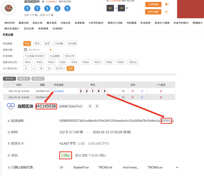 开奖号码依据 https://tronscan.org/ 里的区块高度>哈希值而计算出来。